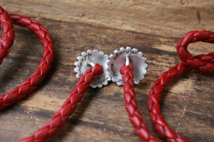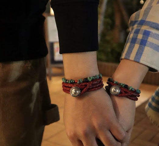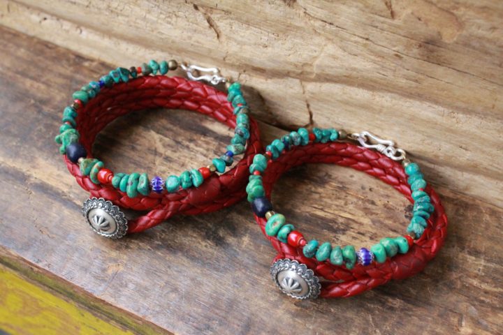 ターコイズベース(ターコイズ多め) , フリンジなしの作り , 鹿革 2重巻き , 鹿革 3重巻き , 鹿革 チェリーレッド